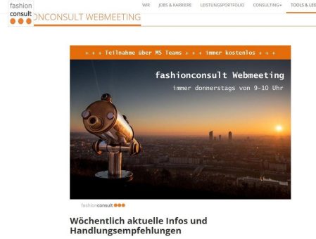 Webmeeting am Donnerstag, 23.02.2023, 09:00 Uhr, mit 3 Themen:Thema Architektur und Ladenbau in der BekleidungsbrancheJochen Messerschmid, MAI Architekten und Innenarchitekten, Stuttgart, beleuchtet die neuesten Entwicklungen beim Hochbau und in der Ladengestaltung, mit inspirierenden Einblicken in erfolgreiche Projekte bei verschiedenen namhaften Händlern. Außerdem werden die Teilnehmer*innen über den aktuellen Stand bei der Grundsteuerreform und den ÜberbrückungshilfenRead more about Webmeeting „Aktuelle Entwicklungen im Ladenbau, Grundsteuerreform und Überbrückungshilfe“ (Webinar | Online)[…]